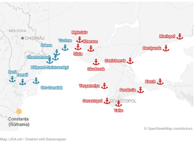*en rouge – les ports ukrainiens bloqués ou occupés par les russes ; en bleu - les ports exploités par les Ukrainiens